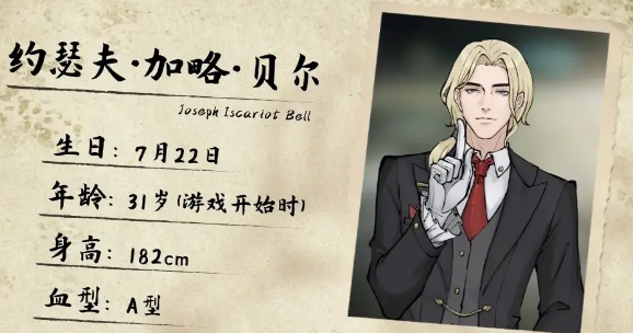 约瑟生日是7月22日,身高182厘米,血型为A,籍贯是英国伦敦,特长为医学和法学,他在游戏开始时是一位31岁的检察官,也是主角哥哥在伦敦的好友,他曾经担任过苏格兰场法医,后来因为屡破奇案,逐步被提升成了刑事侦查处长、分局警长、租界检察官。