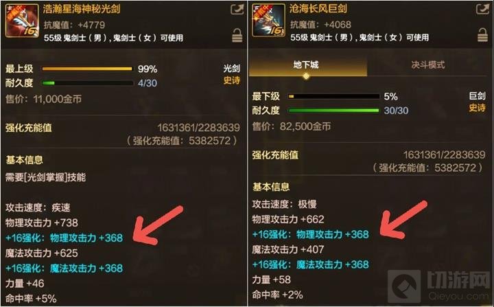 如图,同等级的史诗武器在+16强化的情况下,无论是光剑(原本物理攻击力收益最低)还是巨剑(原本物理攻击力收益最高),获得的强化收益都是“+368”,这缩小了武器基础攻击力的差距。