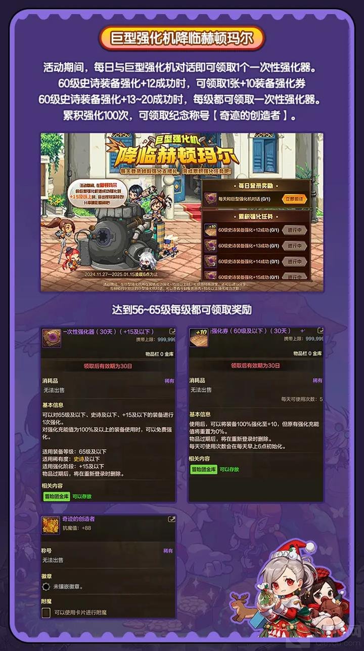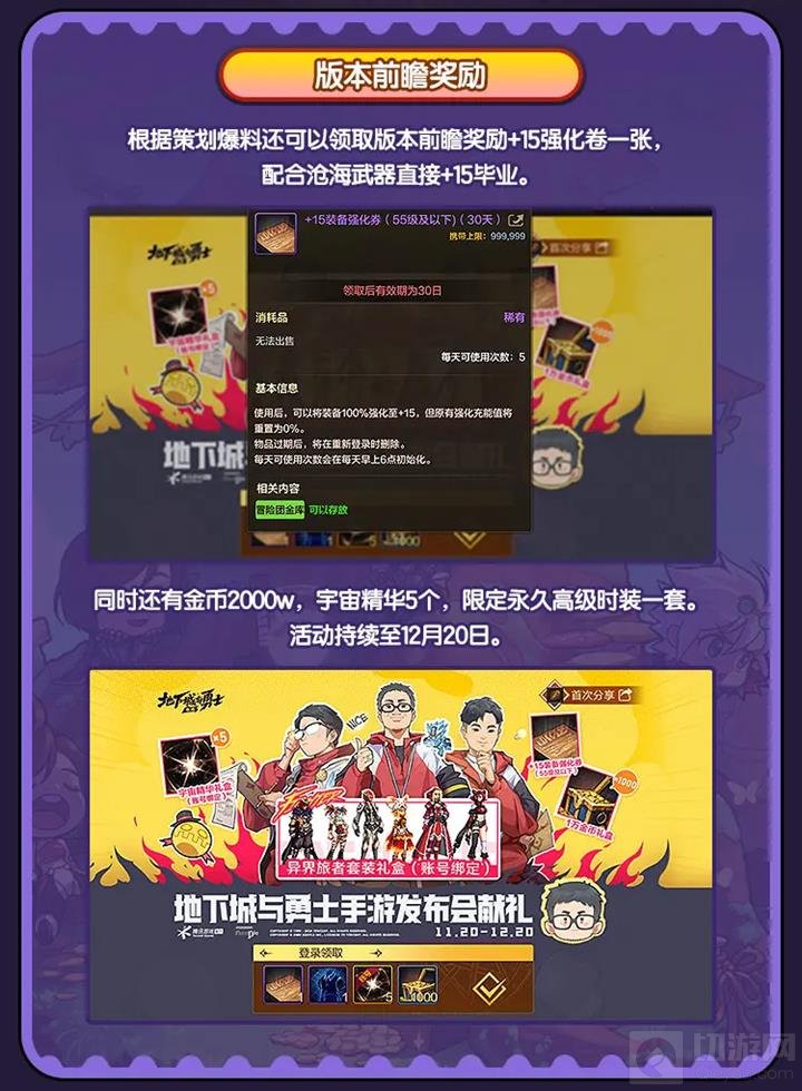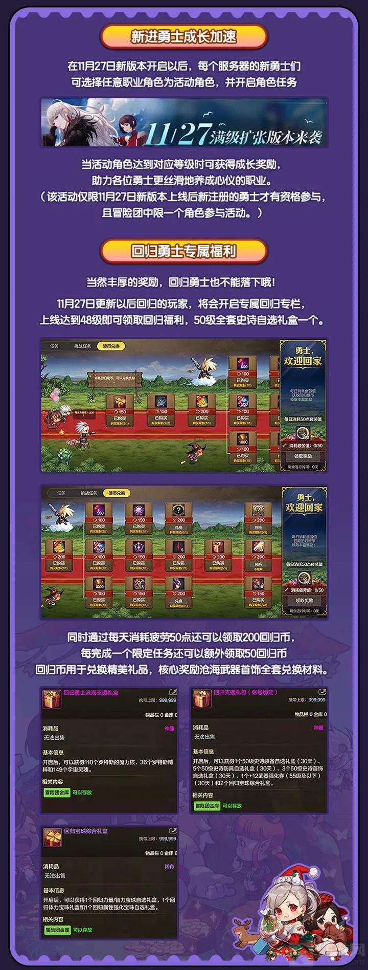 回归勇士在新版本中将获得专属福利,帮助回归玩家快速追赶进度。活动时间:11月27日版本更新后;活动内容:回归勇士在活动期间内,每日登录游戏可获得回归礼包,礼包内含经验药水、金币、强化券等道具;奖励内容:经验药水、金币、强化券等。