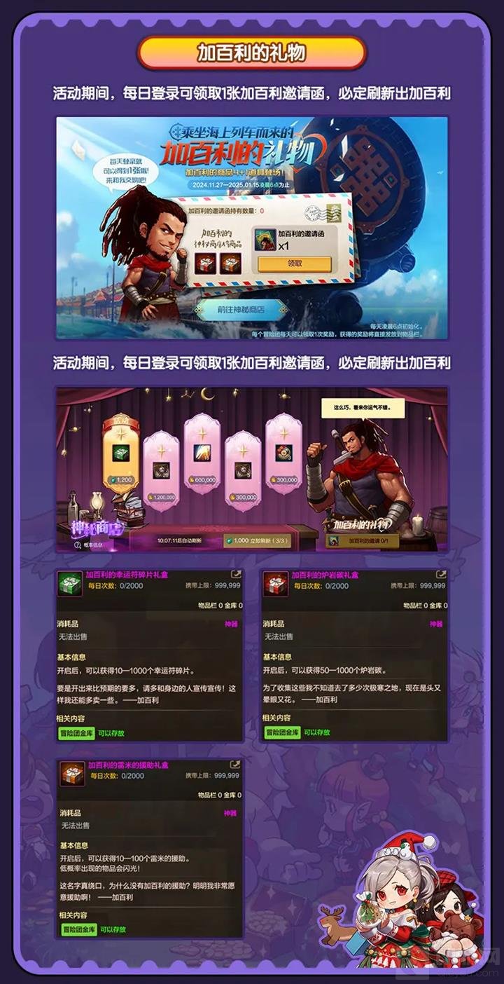 加百利的宝物活动将在新版本中开启,玩家可以通过参与活动获得丰厚奖励。活动时间:11月27日版本更新后;活动内容:玩家在活动期间内,每日登录游戏可获得加百利的宝物,宝物内含随机奖励,包括但不限于强化券、深渊票、金币等;奖励内容:强化券、深渊票、金币等。