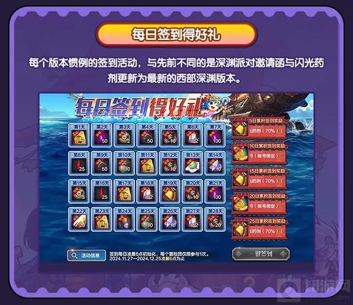 每日签到活动将在新版本中开启,玩家可以通过每日签到获得奖励。活动时间:11月27日版本更新后;活动内容:玩家在活动期间内,每日登录游戏并签到,可获得签到奖励,连续签到天数越多,奖励越丰厚;奖励内容:强化券、深渊票、金币等。