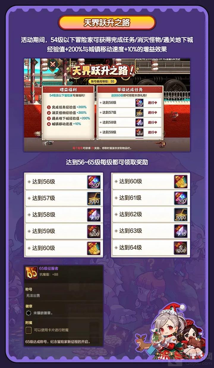 天界跃升之路活动将在新版本中开启,玩家可以通过参与活动获得奖励。活动时间:11月27日版本更新后;活动内容:玩家在活动期间内,参与天界跃升之路活动,完成指定任务可获得奖励;奖励内容:强化券、深渊票、金币等。
