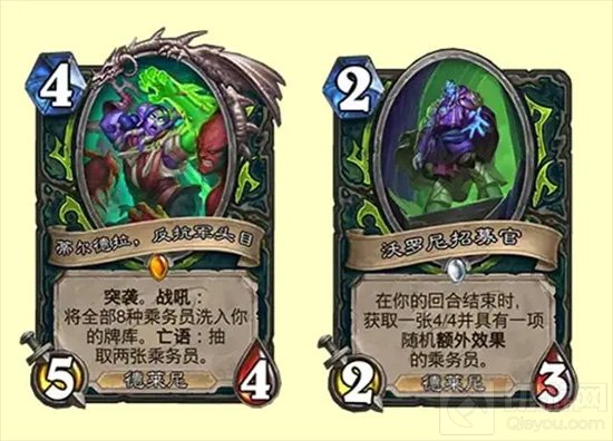 看完了削弱名单,接下来就来看加强名单吧,乘务员瞎的沃罗尼招募官从1/3加强到2/3,蒂尔德拉则是亡语改成了抽两张乘务员,沃罗尼招募官的加强不痛不痒,其实更希望沃罗尼加生命值让他能更容易站住给更多的乘务员,而不是指望他去换怪,蒂尔德拉的加强比较关键,因为橙卡亡语洗到牌库里其实算是污染自己的牌库,亡语能抽两张的话至少也算是能组成一个乘务员组了,可惜的是乘务员费用没有降低,不知道橙卡的这一点加强能让乘务员瞎变强多少。