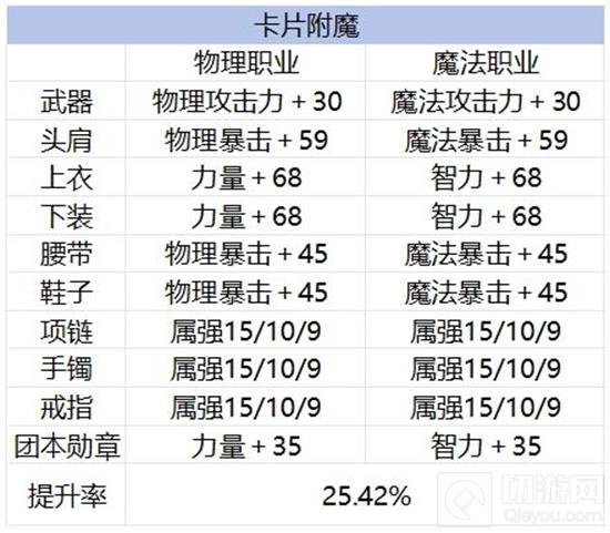 卡片附魔是伤害提升率较大的部分,输出类型的附魔虽然增加的抗魔值与其他属性附魔相同,但在伤害提升上差异显著。以下是当前版本的毕业附魔卡片及其伤害提升率: