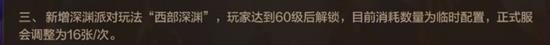 目前,单次深渊需消耗14张西部深渊邀请函,相当于28张55级深渊派对邀请函。官方公告中提到,正式服的消耗可能调整为16张,即32张55级邀请函。