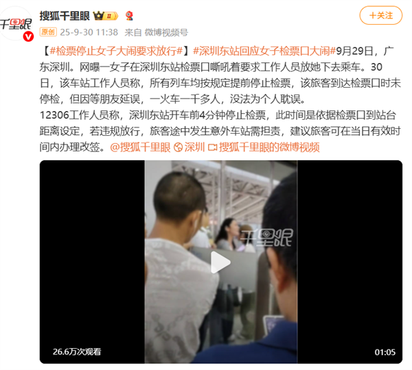 9 月30 日,媒体报道女子列车停检后大闹检票口,要求放行被拒。该车站回应称所有列车均按规定提前停止检票,该旅客到达检票口时未停检,但因等朋友延误,一火车一千多人,没法为个人耽误。