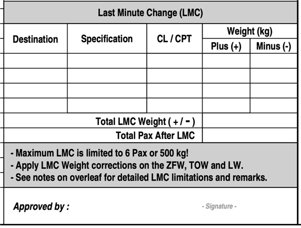 比如,下图就是某航空公司舱单上的“最后一分钟修正”表格。最后一分钟修正能调整的值跟最大无燃油重量,最大起飞重量,最大着陆重量有关。