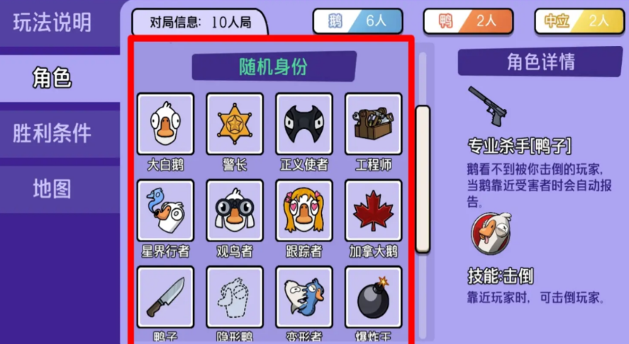 玩家所需要了解的就是轮换模式涉及到八大模式,其中经典模式是整个游戏的基础。也是玩家的起点,玩家进入到鹅鸭杀手游的时候会随机分配身份,而在鹅鸭杀手游中涉及到三大阵营。而每一个阵营所代表的目标都是不一样的,所以玩家在体验经典模式的时候,主要是了解鹅鸭杀手游的规则。