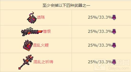 武器:至少会掉以下四种武器之一,遗殇、憎恨、混乱火鞭、混乱之祈祷,掉率25%/33.3%Boss属性。