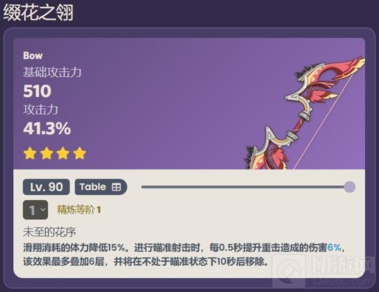 缀花之翎是一把四星弓武器,其满级后拥有510的基础攻击力和41.3%的攻击力加成,因此装备该武器的话对于角色的双爆要求较高。