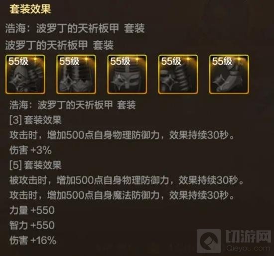 浩海:波罗丁的天祈板甲套装作为板甲套装中的万金油,无论是伤害还是生存能力上都处于板甲中的中上游套装,综合能力强,且暗帝自身作为较少普攻的职业本身不适合穿戴板甲中的浩海:战斗之风套装,那么波罗丁则成为了暗帝本命套装中的第一选择,加强输出能力的同时提高了生存能力。