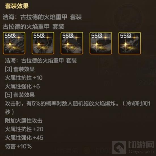 重甲套装中,浩海:古拉德的火焰重甲套装作为唯一拥有属性攻击的套装,在当前版本中自带天然优势,特别是走火强的剑魔玩家可以优先选择,世界BOSS中的表现明显优于其他套装。