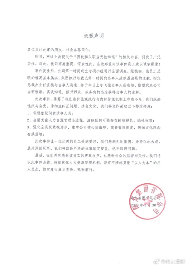 得力集团在致歉声明中表示,公司第一时间成立专项小组进行全面调查。集团执行总裁已第一时间向当事人致以最诚恳的道歉,指定总裁办主任直接与当事人沟通,期望代表公司当面致歉,真诚沟通,倾听诉求,以务实的态度获得当事人的谅解。