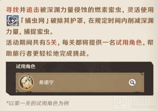 「寻溯蜜虫之宝」是一个限时活动,从2024年10月10日10点开始至10月11日3点59分结束。在这段时间内,你需要寻找并追捕那些受到深渊力量侵蚀的燃素蜜虫。每个关卡都会提供一名试用角色,助你更轻松地完成挑战。第一天的试用角色是新角色希诺宁,也可以正好趁这时候进行上手体验。