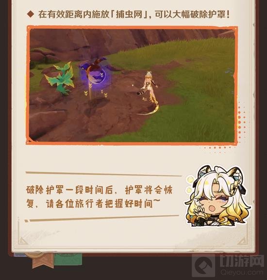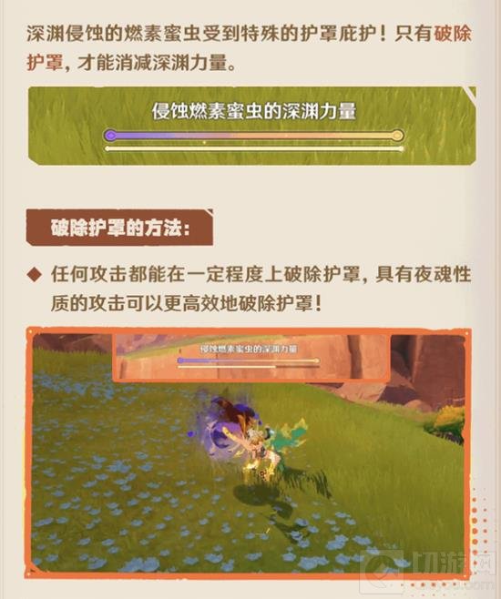 破除护罩:任何攻击都可以在一定程度上破坏燃素蜜虫身上的护罩,有夜魂性质的角色可以更高效率地破坏掉这些深渊护罩。使用有效距离内的捕虫网,还可以大幅破坏护罩。不过要注意的是,破除护罩的一段时间后,护罩将会自行慢慢恢复,因此一定要记得护罩打掉后速战速决,被拖太长时间了就不好了。