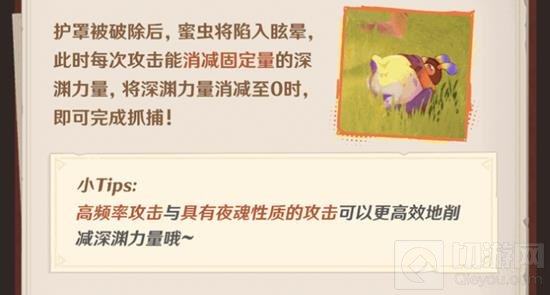 消灭深渊力量:当护罩被破坏后,蜜虫会陷入眩晕。此时每次攻击都能消减固定数量的深渊力量,直至力量降至零即可完成捕捉。高频率攻击和具有夜魂性质的攻击,可以更加高效地削减蜜虫身上的深渊力量。