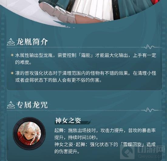 凛是一位在冰雪神域中拥有主场优势的输出型龙胤,她的花滑技艺使她能够在战斗中以优雅的姿态发挥出色的伤害。
