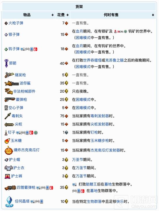 军火商出售各种枪械和子弹,包括银子弹和迷你鲨,这些在游戏的中前期对玩家非常有帮助。