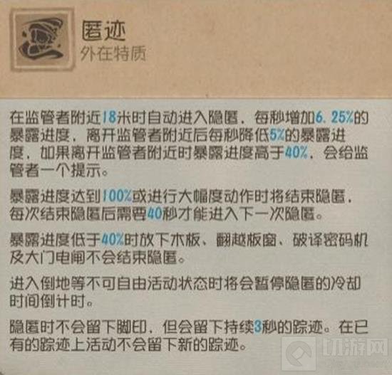 暴露进度:暴露进度的增加和减少受距离监管者远近的影响,大幅度动作或暴露进度过高时会解除匿迹状态。