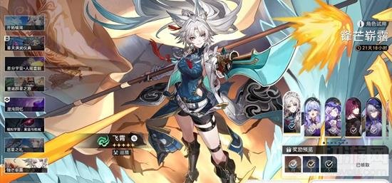 首先我们打开飞霄的试用关卡,之后我们进入试用关。飞霄试用关卡在哪里呢?我们可以点到活动页面,看左边一列偏下方的【锋芒崭露】,这个就是角色试用关了。我们点开,即可看到飞霄的试用关卡入口。