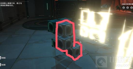 1层右上角的解谜如上图所示。按照提示将这三个方块放到上面即可。