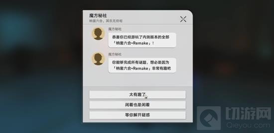 这六个做完后会受到一条来自于魔方秘社的消息,我们直接进行对话即可。完成对话之后,会接取新任务《枘凿六合·制作组专访》,同时这六个魔方解密会刷新,需要重新做一遍。