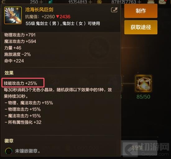 目前鬼剑的毕业武器为团本武器【沧海长风巨剑】。这把武器之所以能成为现阶段的毕业武器,除了其随机的四个属性很强大(物攻15%、魔攻15%、物魔双攻15%、属性强化32,这四个效果里面随机一个持续30秒,每30秒轮换一次)之外,固定的属性技能攻击力25%可太香了,对于技能释放频率较高的职业来说十分适配,技能放得越多,伤害提升就越明显。