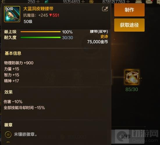 在此推荐两个腰带装备:大蓝洞皮鞭腰带、脊石腰带。这两件装备的共同特点是都可以减少技能冷却时间,达到更频繁的技能释放,但同时会以伤害有所降低为代价。但是与武器本身的效果合在一起看,大蓝洞皮鞭腰带和沧海长风巨剑加起来的效果为1*1.25/0.85*0.9=1.323529倍伤害(粗略计算),脊石腰带和沧海长风巨剑加起来的效果为1*1.25/0.88*0.95=1.349432倍伤害(粗略计算),这两件综合下来还是有很多的提升。