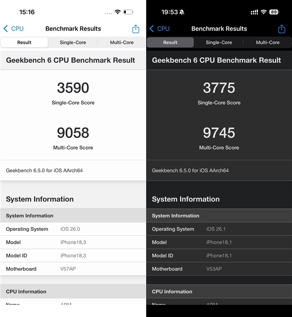 iPhone 17系列的两款机型分别搭载了A19与 19 Pro芯片。两者CPU架构基本一致,主要差异在于GPU核心数、缓存容量,以及iPhone 17 Pro首次引入的 VC 均热板散热系统——这也是苹果史上首款采用该技术的iPhone。