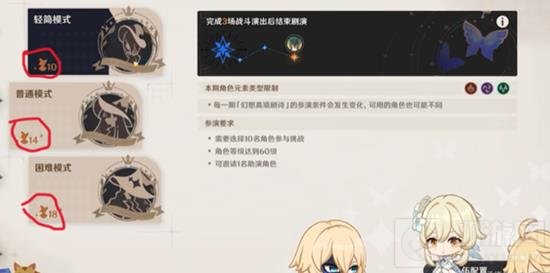 活动中,根据可出战角色数量(包括玩家自身已有、系统配送以及从好友处借取的角色)的不同,有三档模式(简单/普通/困难)的表演供玩家选择,未达到要求的人物数量时无法开启对应难度表演。困难模式具备八幕难度、挑战目标不一的战斗场景,通过后可直接获得全额奖励。从5.0版本开始,完成【困难挑战】后,剧诗还新增了【卓越挑战】,幕次、奖励及所需的参演人数进一步上升。