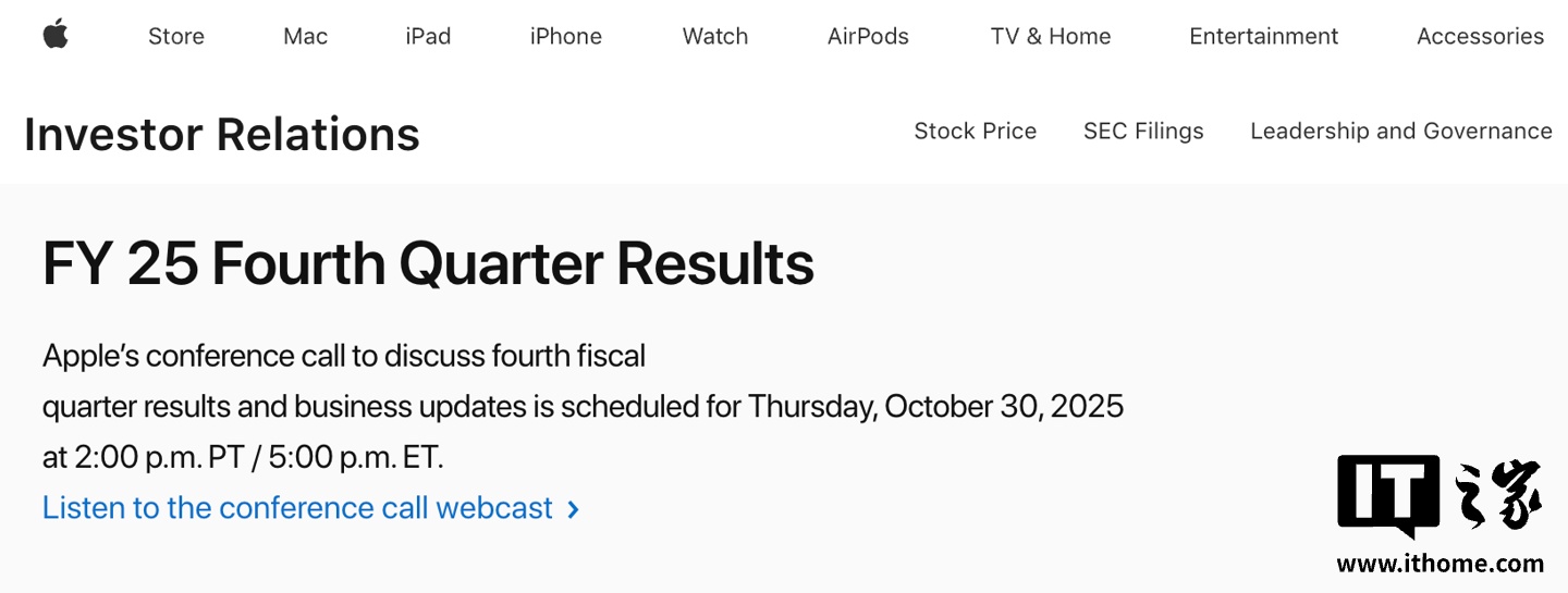 10 月 3 日消息,苹果今天宣布将于 10 月 30 日(星期四)公布季度财报,并举行电话会议,时间定在当天下午 2 点(太平洋时间)/下午 5 点(美东时间),届时可通过网络直播收听。