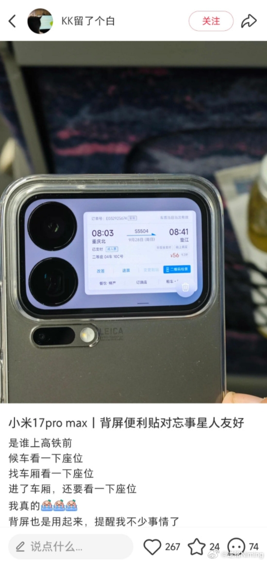 作为小米17系列的核心创新点,Pro版本搭载的“妙享背屏”投入超10亿元研发成本,采用与主屏同材质的龙晶玻璃,支持LTPO自适应刷新率,2.1英寸AMOLED屏幕横向覆盖后摄模组。