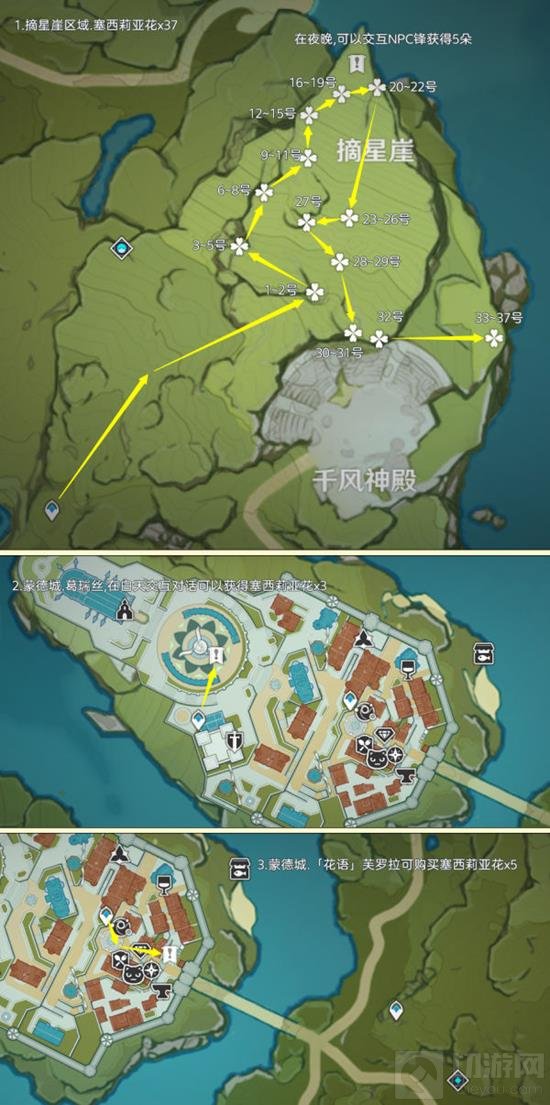 塞西莉亚花点位仅分布在蒙德地区摘星崖区域,其中可采集数量为37株,蒙德特产就是好找;制作路线时尽量遵循从上往下游,视野高好看清,方便旅行者探索。