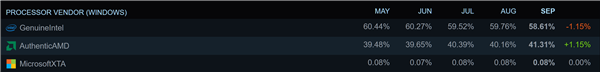 此外,8核CPU的份额正在稳步上升,目前已达到25.28%,较8月增长了0.87%,与此同时6核CPU的市场份额首次降至30%以下。