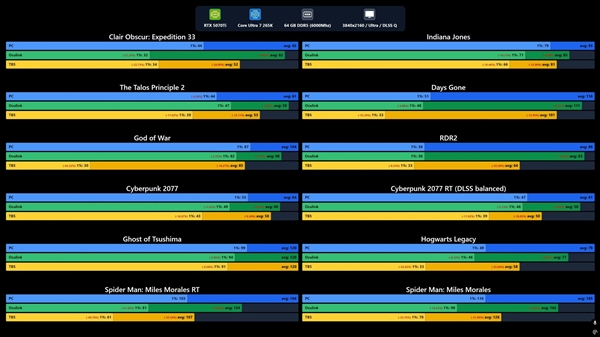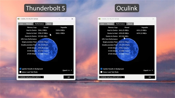 外媒使用一款Peladn Link S-3外置显卡坞进行了测试,显卡采用RTX 5070 Ti,雷电5平台则由华硕ProArt Z890主板、酷睿Ultra 7 265K组成。