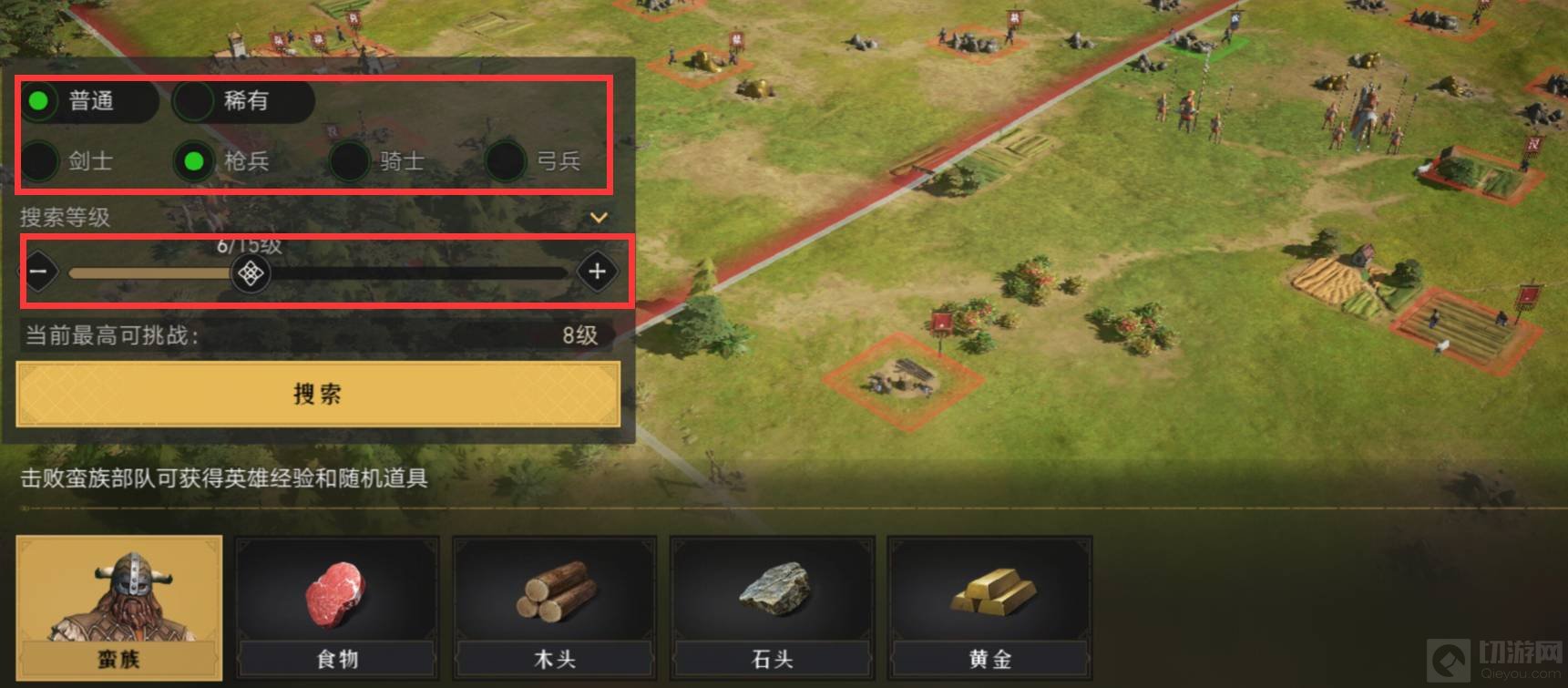3,可以选择蛮族或者稀有蛮族,选择想要攻打的蛮族兵种以及等级搜索就可以了。