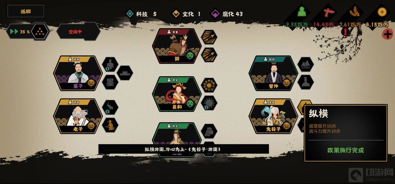 1.鬼谷子的技能偏软,作为贤者属性加不少军事,技能一纵横,威望提升10点,战斗力提升10点,中规中矩,优点是五分钟就能升好且消耗不多。