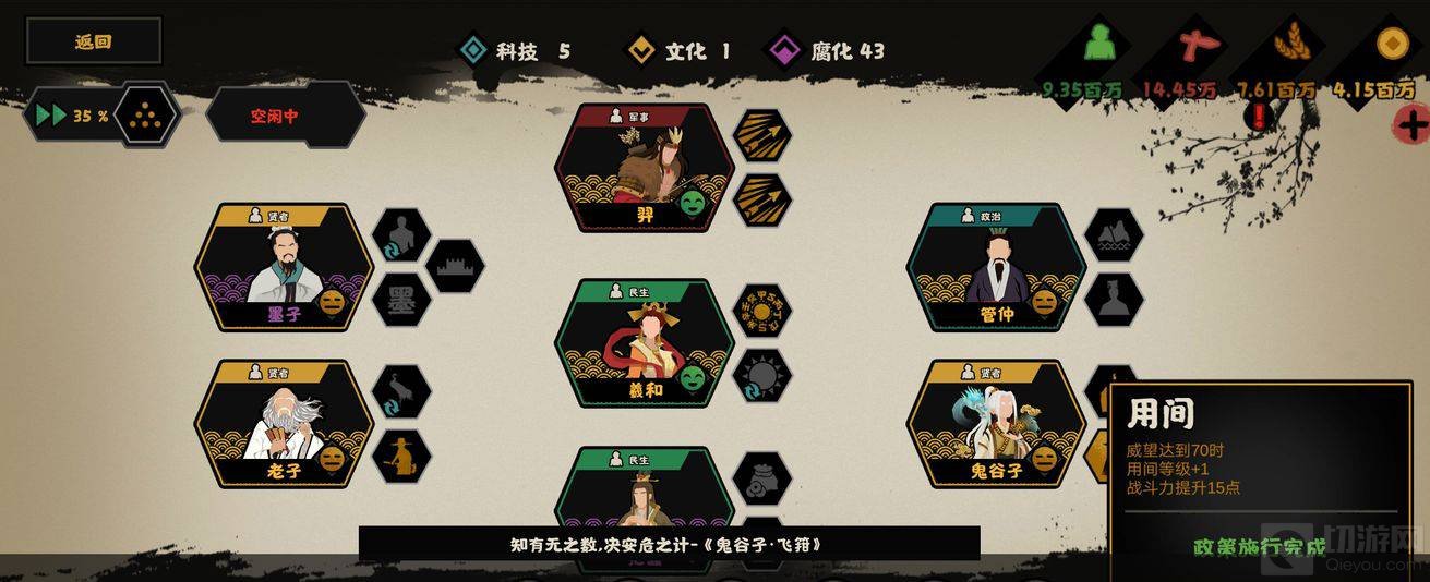 3. 终极技能可以通过50点威望直接把一座城拿下来,虽然看上去这个技能没啥用,但对于后期的克星国或者枪兵国来说可以省很多麻烦。以前得等到五星才能有这个技能。那时候肝的头皮发麻都没能体验到这个用间。现在直接开放让鬼谷子正式步入一流贤者。