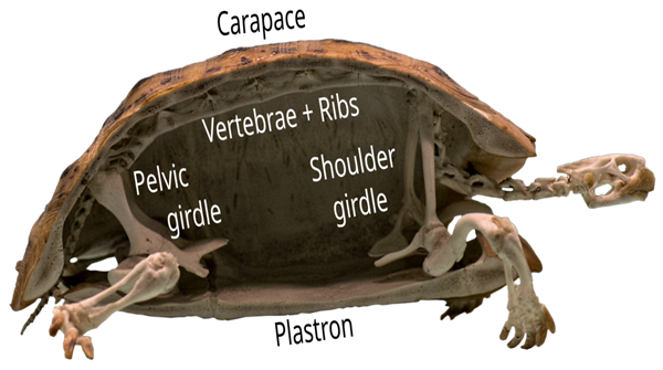 龟壳背甲是由脊椎和肋骨组成的,外部覆盖一层由角蛋白组成的、可生长的鳞甲,就像其它一些爬行动物一样,而腹甲主要是由胸骨发育而来,外层也由角蛋白覆盖。