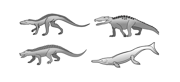 不过,鳄鱼的可塑性似乎比龟鳖类强一点,历史上出现过许多各种各样生活方式的鳄鱼,它们有着完全不同的生态位,包括四肢直立的、奔跑追逐的鳄鱼,包括食草的鳄鱼,甚至还有像海豚、蓝鲸一样的鳄鱼。