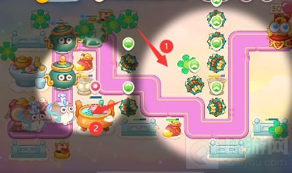 2、这一关开局放置一个风扇清怪,右侧放置一个分裂箭开图。