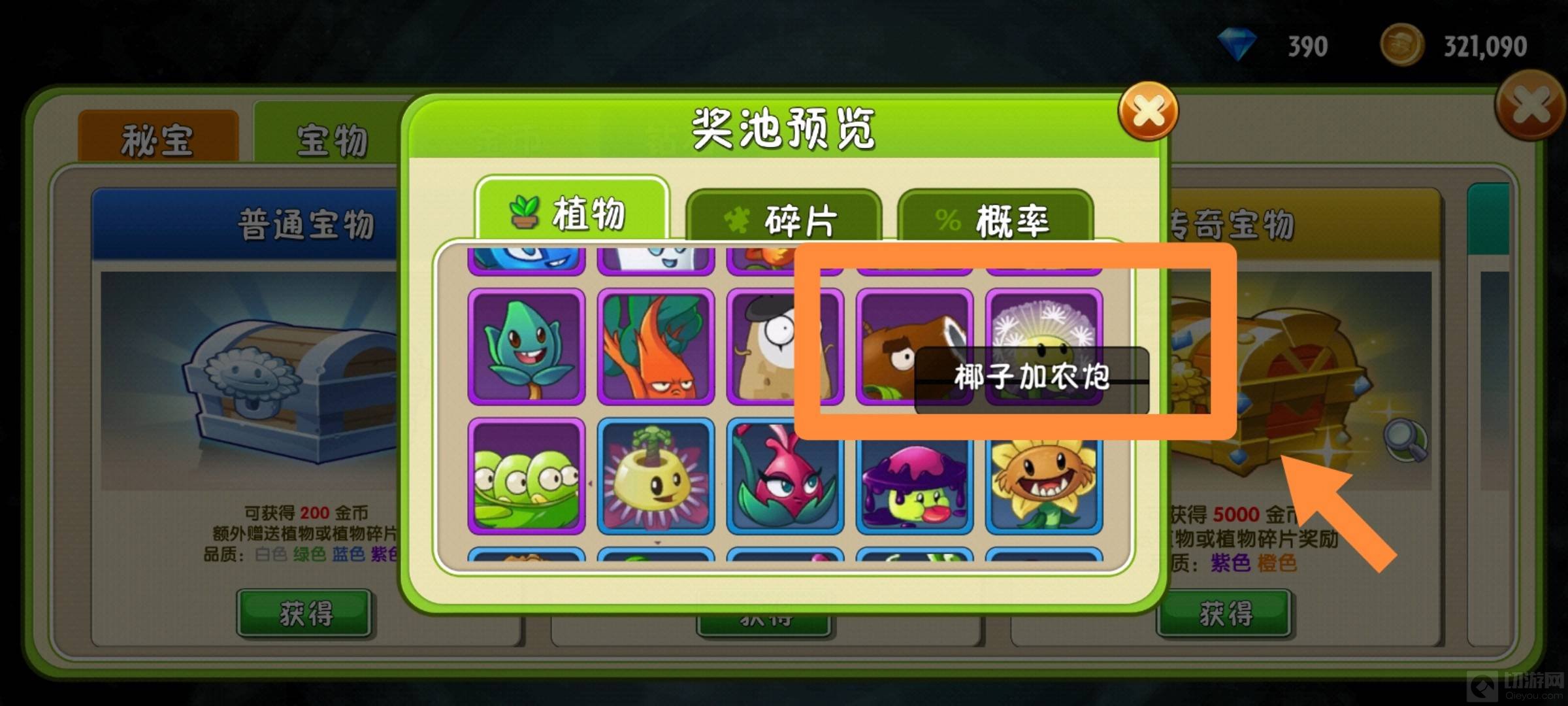 2、在秘宝中开启潘妮的宝物,就有机会可以获得椰子加农炮。