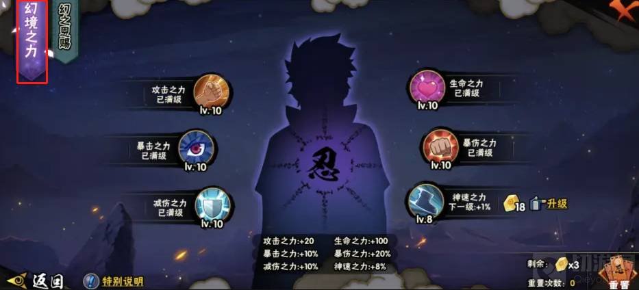 2.幻境之力升级,升级顺序建议攻击、暴击、生命、减伤、暴伤、神速。