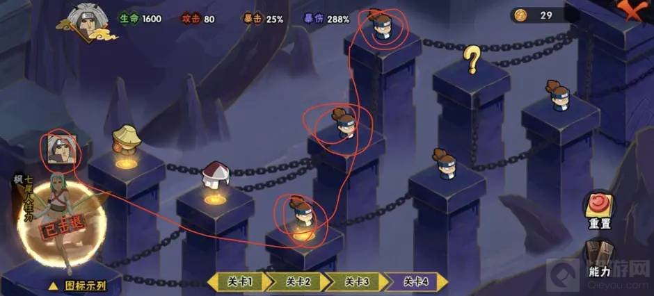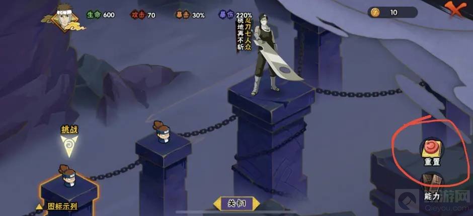 3.第一关boss如果不是比较好大的就点重置,直到刷新出比较好打的Boss。这个重置不影响猿飞日斩的初始能力,初始能力是加生命还是加攻击加暴击什么的影响不大。没必要退出刷新这个能力。当然最好的还是加10攻击力和第四关额外宝箱比较好。