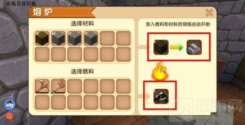 5. 右击熔炼炉。将挖到的精铁矿放进去,选择燃料,几十秒后精铁矿就煅烧完成了。