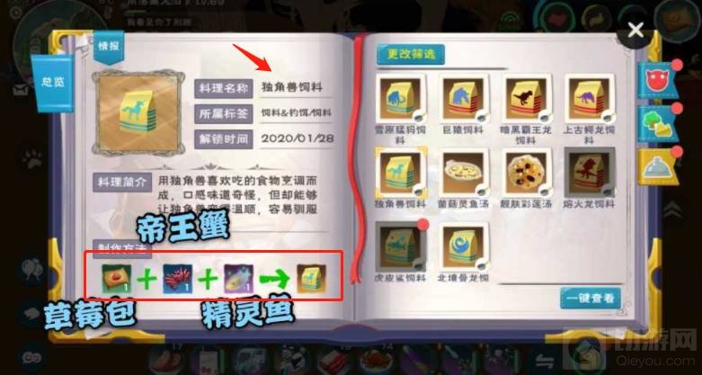 1、独角兽属于陆地坐骑,制作独角兽的饲料需要三种材料,分别是:精灵鱼 帝王蟹 草莓饲料包。