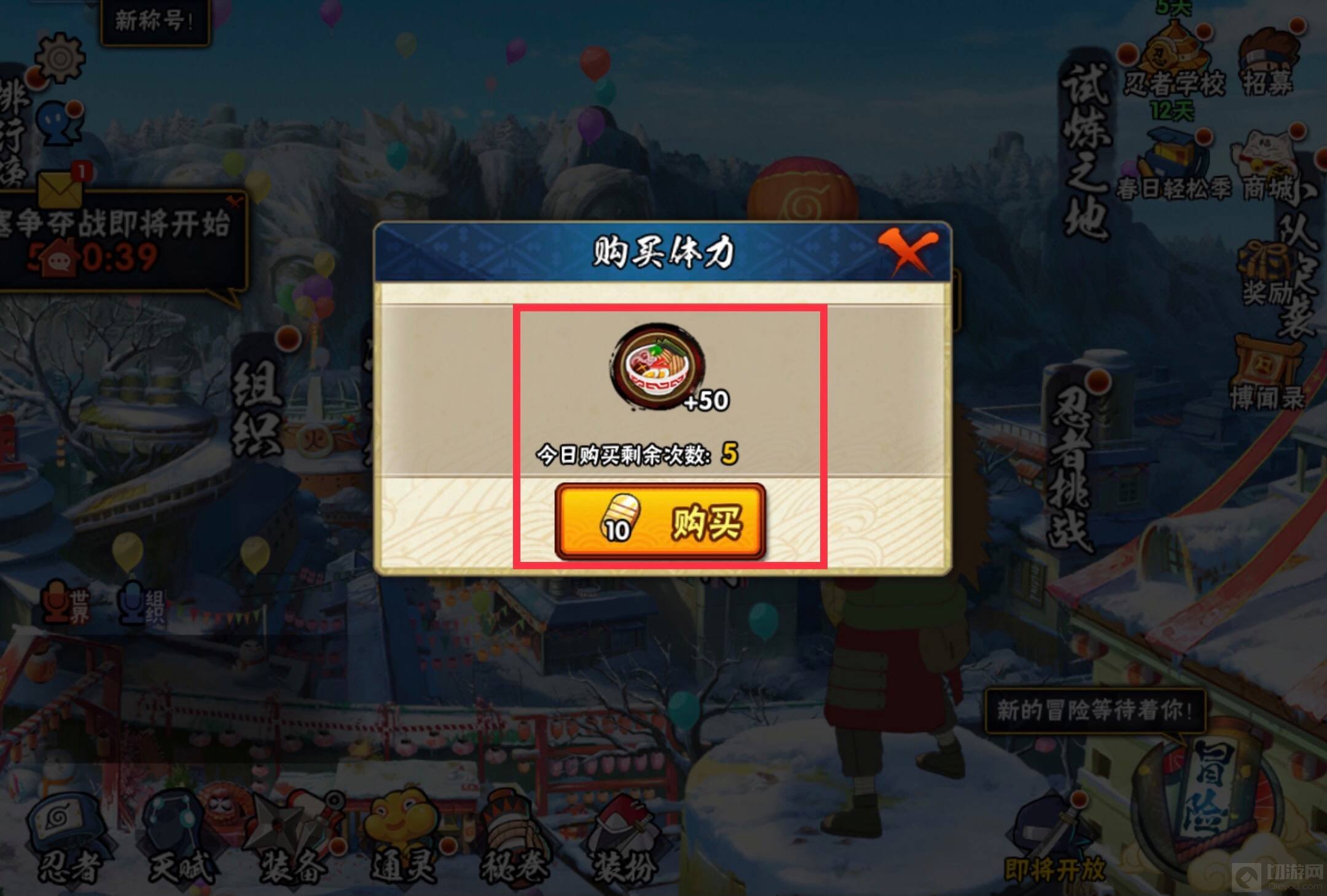 2、还可以每天够买5次体力,每次花10金币可以购买50点体力。