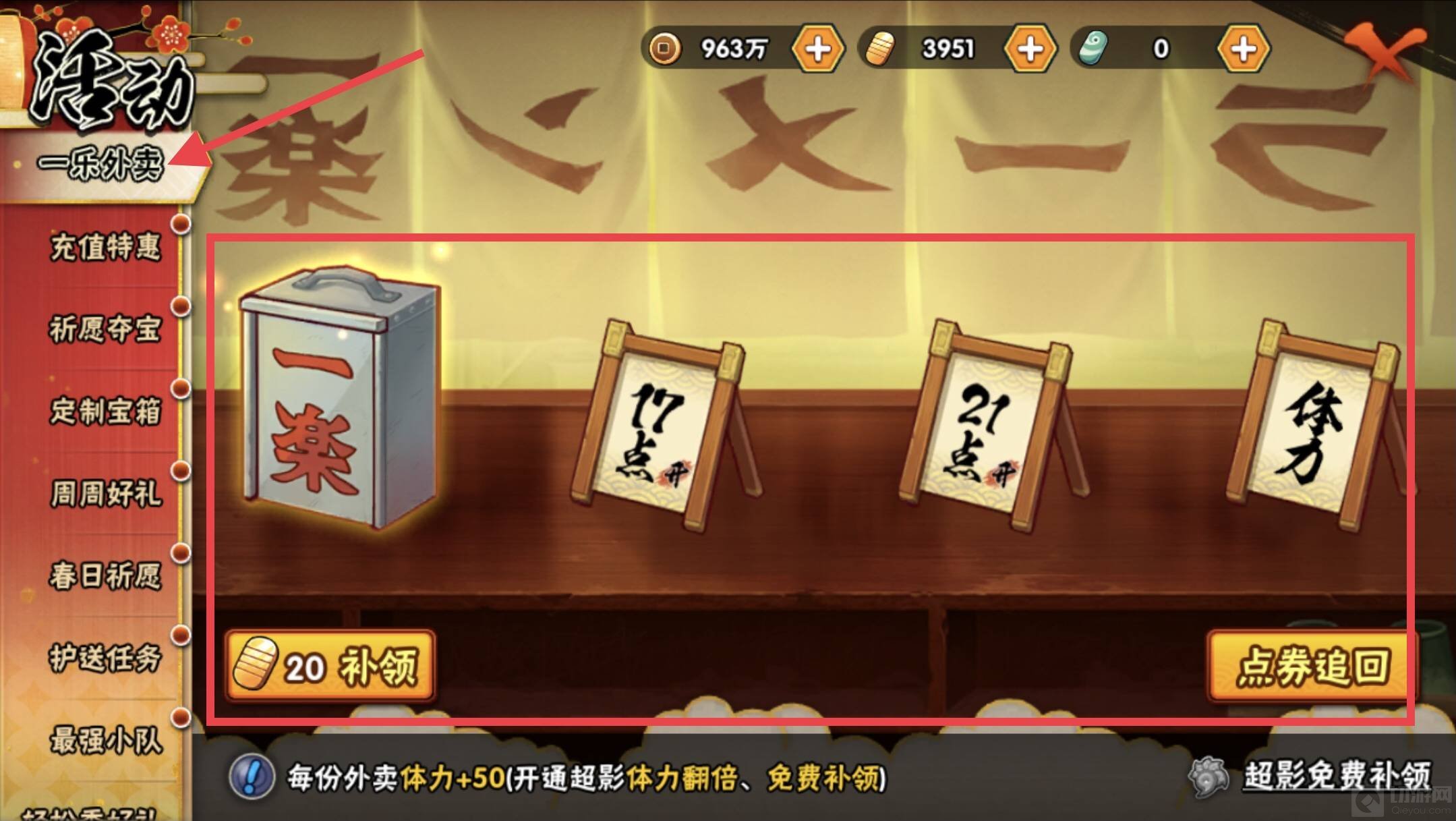 3、活动界面一乐外卖里,玩家每天可以免费领3次体力,如果错过未领,可以用20金币补领。