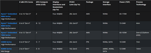 有趣的是,这是嵌入式锐龙处理器第一次完全移植桌面版本,而之前的嵌入式锐龙8000系列都是移动版,嵌入式锐龙7000系列则混合了桌面版、移动版。