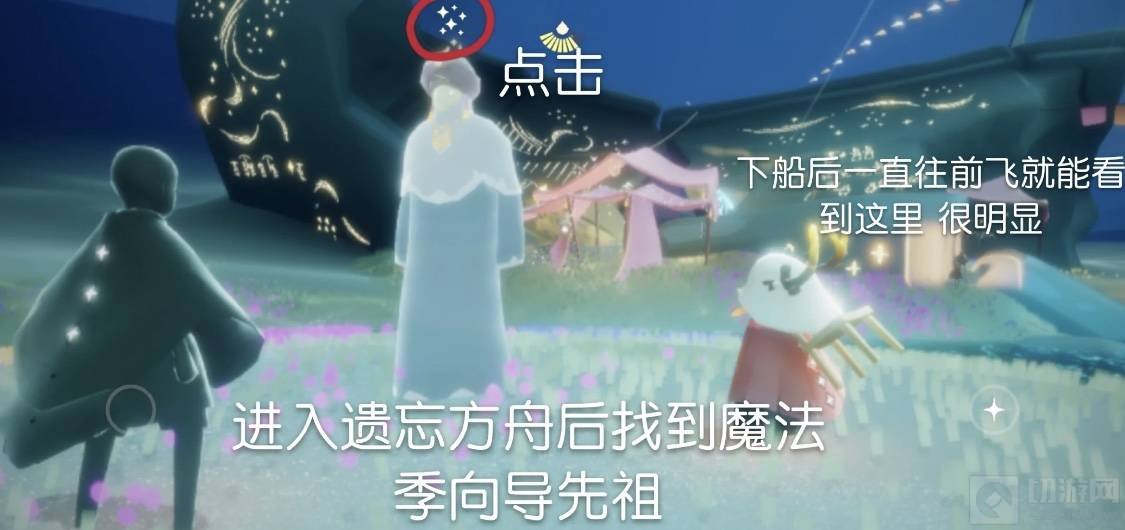 1、先进入暮土的遗忘方舟地图内,点击向导先祖头上的标志领取水之灵任务,接着会触发一段动画,提示你水之灵的所在位置。